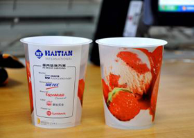 本次展会上,天锐VE2300/p系列包装机演示了高技术含量的模内贴标方案,周期为5.9秒,材料为PP,产品净重为12.6克。