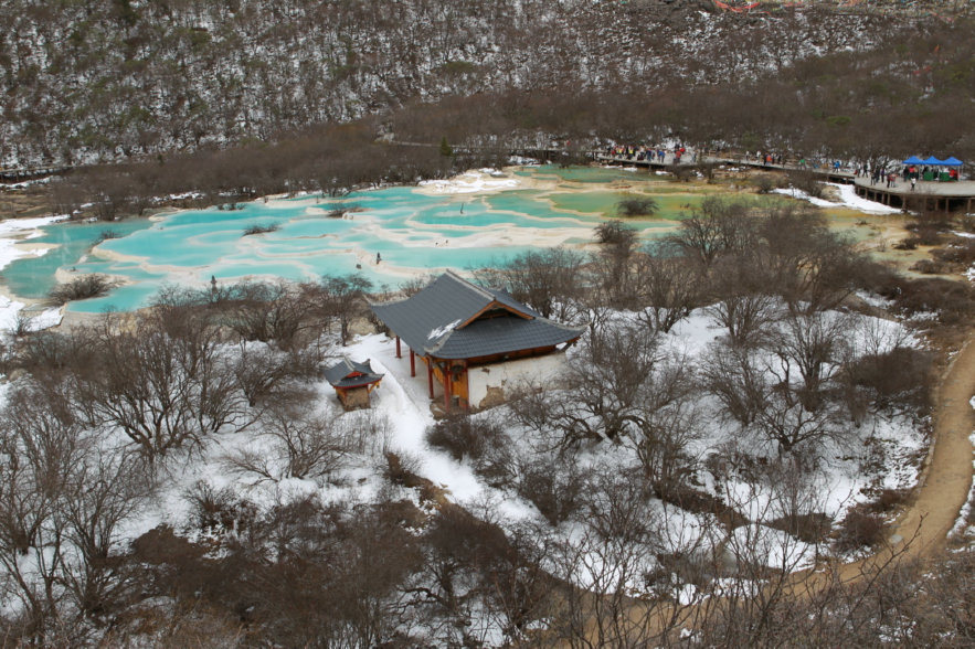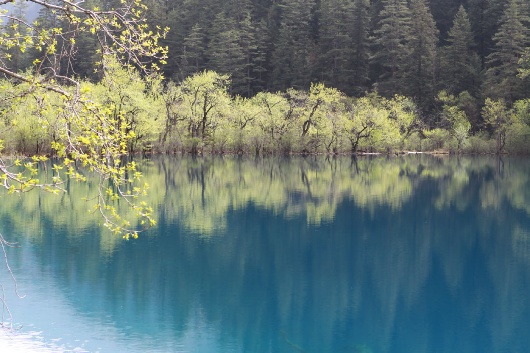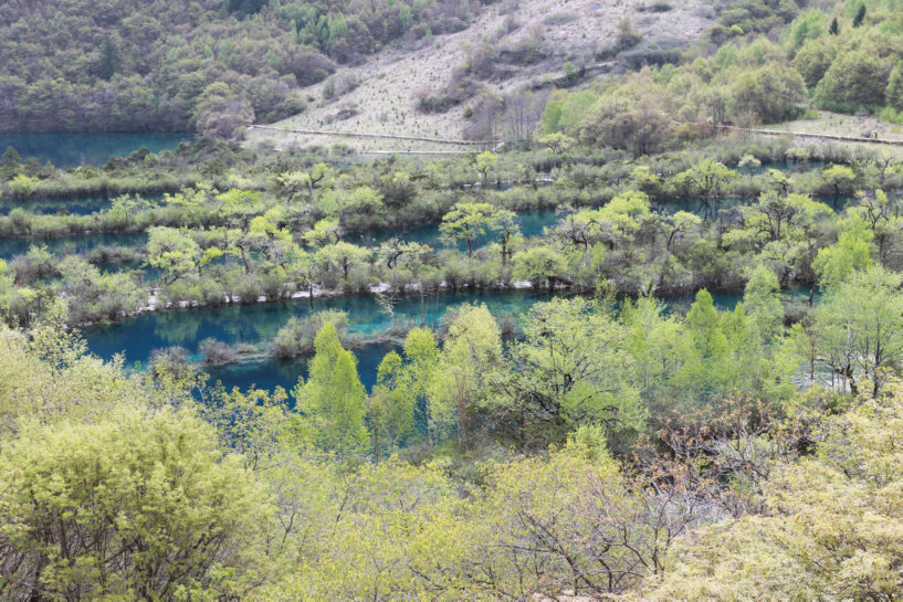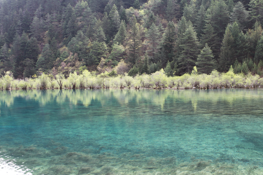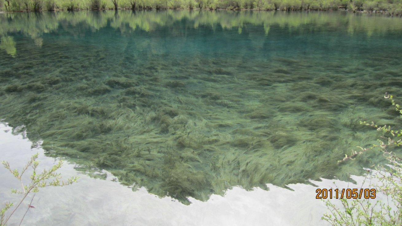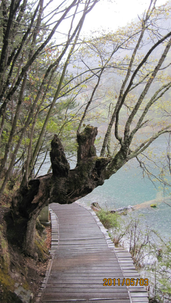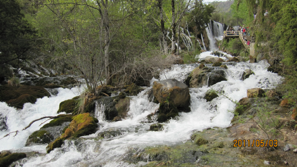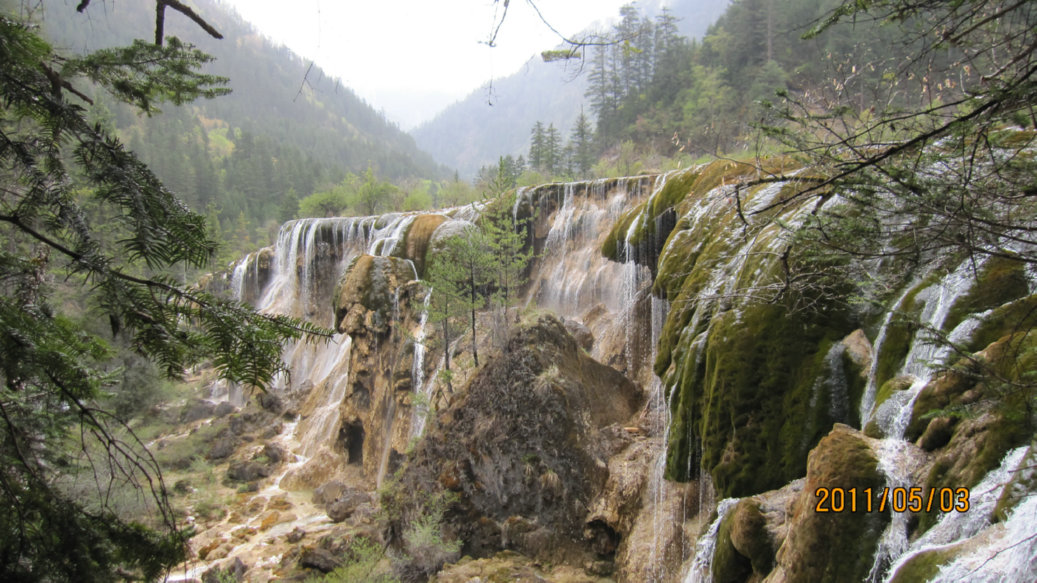水是九寨沟的精灵。“树在水中生,水在树间流”应该是树正群海的一个奇景。你看那灰黄色的钙华堤上长满了柳树、柏树、松树、杉树。上部海子的水翻越湖堤,从树丛中溢出,激起白色的水花,在树丛中蹦蹦跳跳,发出悦耳的流水声。水流顺堤跌宕,形成一幅幅婀娜多姿,婉约变幻的水帘,让我们仿佛来到了童话般的世界。